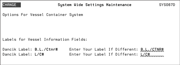 Using this system wide setting you can change the default titles on the Vessel/Container Search and Inquiry Screen, and on related reports. The Vessel/Container Search and Inquiry Screen provides a quick and simple search through the vessel and container information on your system. You can change the headings of two of the columns to more closely match your business terminology. Changes made to the titles are reflected on all the programs that use either the L/C or the BOL fields for Vessel/Container management. The areas affected are as follows:
