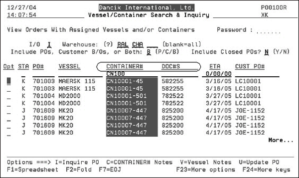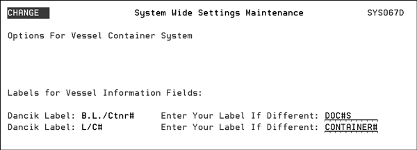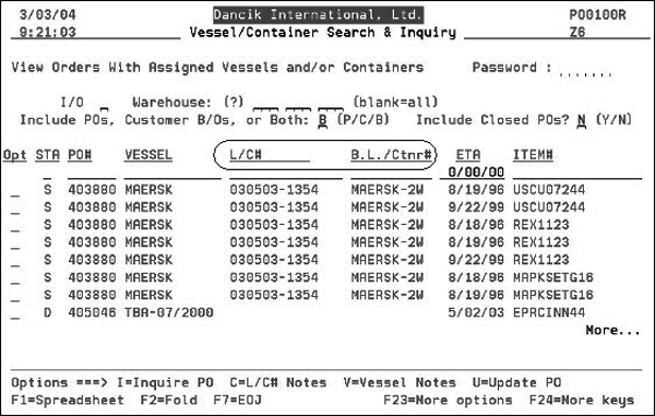 Note The L/C# field is 14 characters long, and the B.L./Ctnr# field is 10 characters long. Many companies prefer using a full container number as their main tracking number, and many companies do not use L/Cs (letters of credit). Therefore, relabeling the L/C# as CONTAINER# (as shown above) may be of benefit to you. The figure below shows the Vessel/Container Search and Inquiry Screen with the new titles.