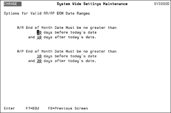 The defaults are automatically inserted into the fields. Using the default entries, an operator could not process AR EOM if the date entered was 10 days before or after today’s date. Furthermore, if AP EOM is being run the date cannot be more than 10 days before today’s date or 20 days after. If an incorrect date is entered during EOM, that does not fit within the range of valid dates, an error message appears. Note If the these System Wide Settings are left blank, the system will not perform the date check. It is highly recommended that you activate these settings. |