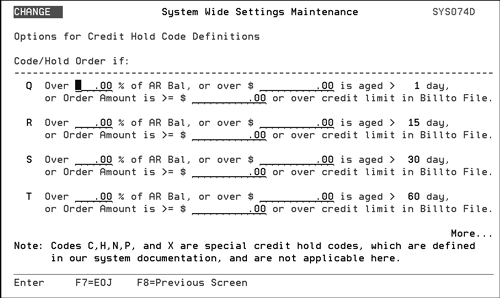This system wide setting lets you establish credit hold parameters for almost all of your credit hold codes. Note Codes C,H,N,P, and X are special credit hold codes and are not applicable here. Use these settings to identify and stop potential problems.