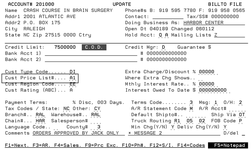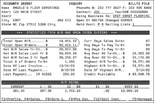You may enter any of the available credit hold codes on this screen. Omit Open Orders from the Credit Hold calculation for the following Credit Hold Codes - You may enter any of the available credit hold codes on this screen (C, 0, 1, 3, 6, P, Q, R, S, T). Any codes entered into this screen will no longer consider open orders as part of the credit formula. Note: To display a listing of all the code, enter a “?” in the field and press Enter. As an example of how these credit hold codes work, consider the following screen from the Billto File.