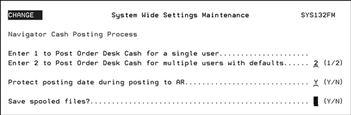 The setting Save spooled files places the reports produced during the cash posting process, Order Desk Daily Cash Report and Cash Edit Report, in a HOLD status. If this setting is not activated, set to “N” the reports are automatically deleted after they are printed. |