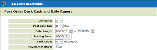 Enter a “Y” in the Protect posting date during posting to AR to take away the ability to change the posting date when posting order desk cash. The field will be grayed out and today’s date is defaulted in.