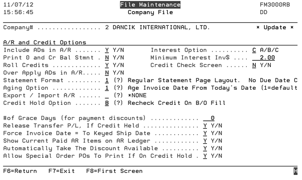 Enter Y to print zero or credit balances when requesting AR statements. Otherwise, enter N. |