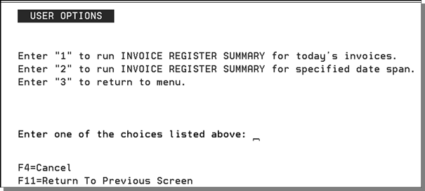 - From the main menu, select option 6 - Print Invoice Registers. On the screen that appears, choose one of the three register formats: