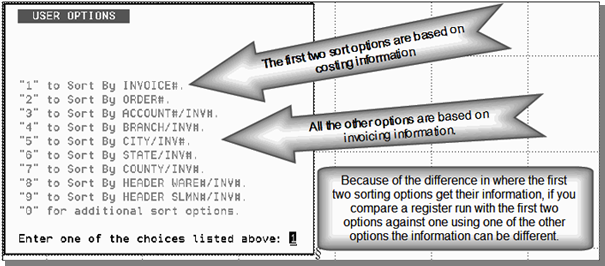- If you choose option 1 to run the register only for today's invoices, the next screen to appear presents you with several sorting options. If you choose option 2 to run the register for a date span, a parameter selection screen appears.