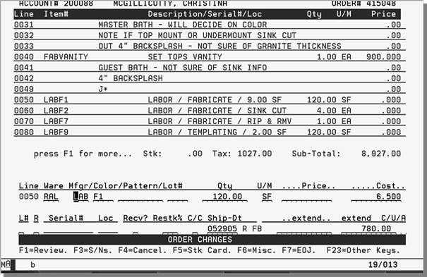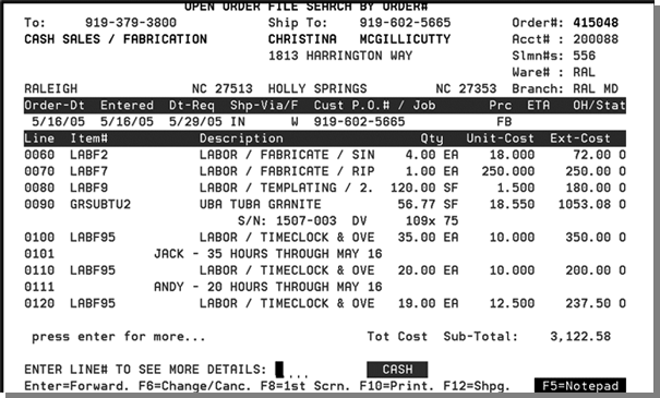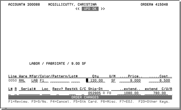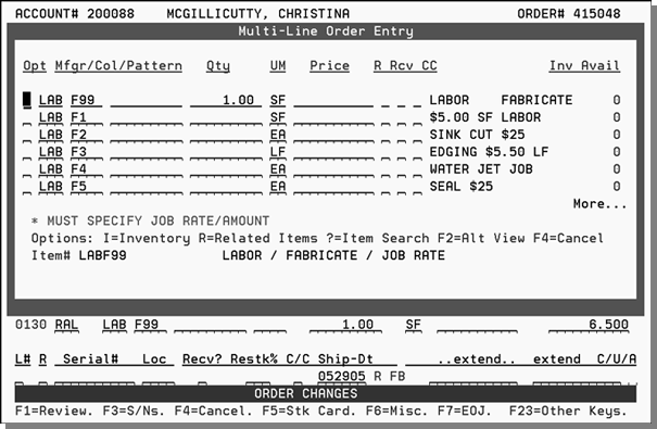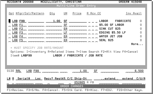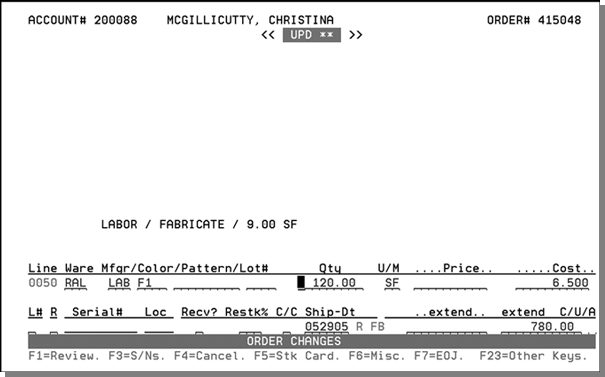 This outline is based on pricing your fabrication/installation order as a single line entry to quote a cusÂtomer for the job. The single line has the total job quote priced to the customer and does not have any cost associated with it. The cost of the job is calculated by entering the actual material and labor line items where these lines have cost and no price. In addition to entering the order using this method, comment lines (F6- Misc. Line) are used using J* to control what lines to print on the order.