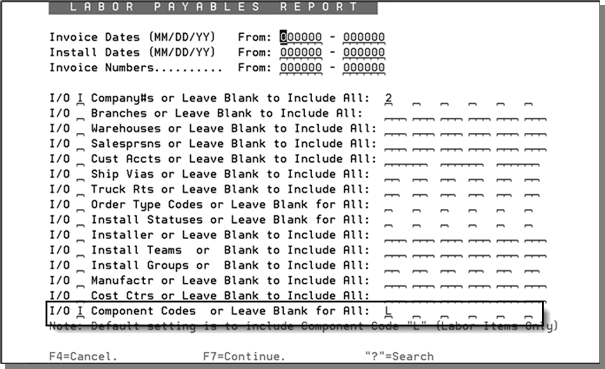 Use the Installation Scheduler to request your Customer Labor Approval or Labor Purchase Order. Run the Labor Payable Report to compare to your AP invoices. The Labor Payable Report lists only invoiced fabrication/installation orders and it has parameters that you can choose to list the different labor items and their associated cost. We recommend that you run the Labor Payable report to include component L (this is the default) by invoice date, install date, or invoice numbers. All other fields are optional.