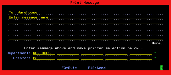 Message printing was developed as an alternative to using the Send Message feature on the AS/400. It is a way to get messages to people or departments that may not always be signed onto the system. You can send messages to a pick list printer or a bar code label printer in the warehouse where in some cases the printer is monitored more often than the screen. You can use PRTMSG to create a printed message to be printed on any plain paper, bar code, or pick list/invoice form printer.
