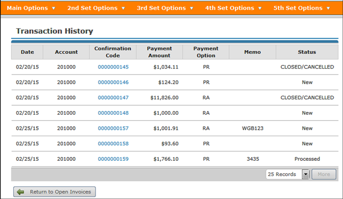 The status codes used on the Payments tab are created and maintained the Online Payment Status Codes screen accessed via menu option ACT 122.
