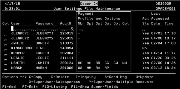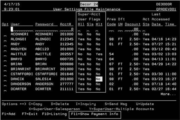 The F11 function key on the main User Profile screen allows you toggle between Showing Online Payment Information and the Super-User Fields. The default is to show the Super User settings.