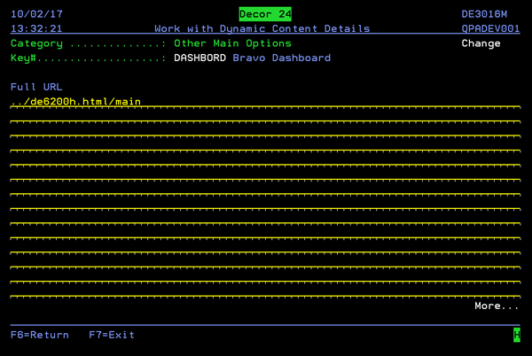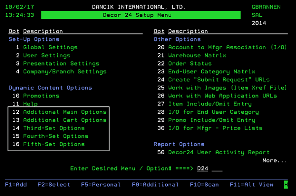 - Decide where you want the Dashboard link to appear. If you want it to appear with the top-level options use option D24 12 on the Decor 24 menu. Using option D24 13 moves the link down one level and so on.