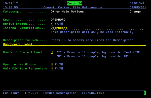 - Once the location of the dashboard has been selected, press F1 to create and define dashboard specific settings. Ensure the Omit D24 form Parameters field is set to N. This stops D24 from adding additional information to the web address and allows access to the information.
