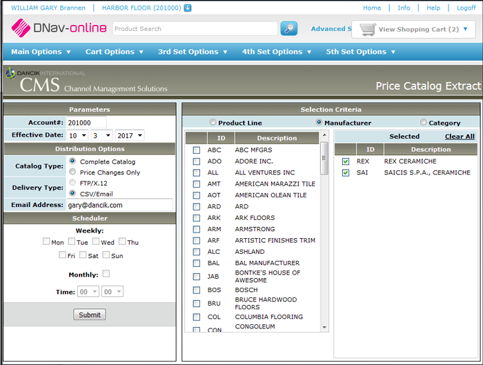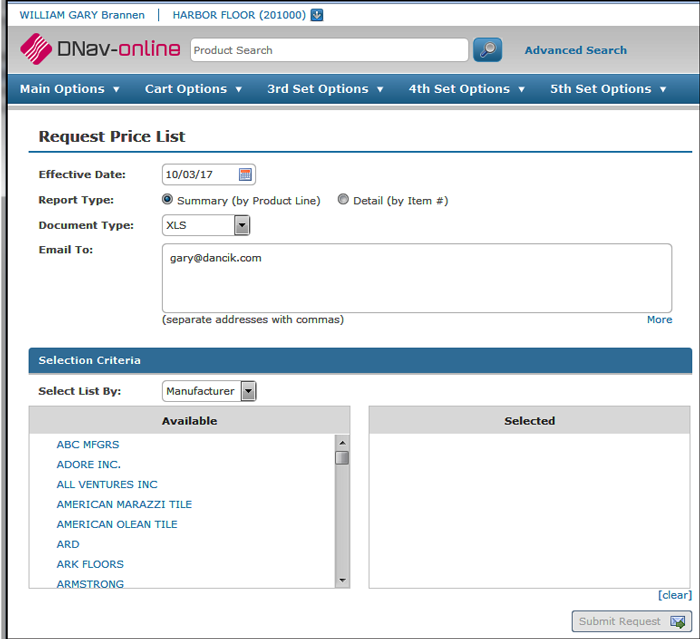 The Price List link, located under the 3rd set options heading, allows your customers to request pricing information by Category, Manufacturer, or Product Line in a variety of formats. This information can be requested for all your products or it can be customized down to a particular category.