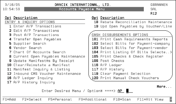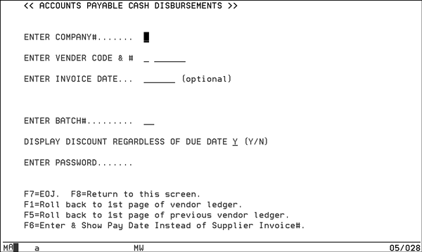 - From the Accounts Payable menu, enter option 103 - Select Bills for Payment (by vendor) the Accounts Payable Cash Disbursements screen appears.