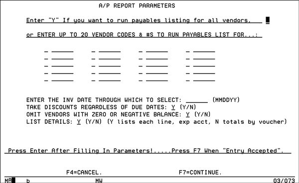 - To run listings for select vendors skip the first prompt and enter the appropriate vender codes and numbers. Remember, if the vendor is in the Vendor File, the vendor code is V; if the vendor is in the Supplier File the vendor code is S; and if the vendor is a miscellaneous vendor the vendor code is M.