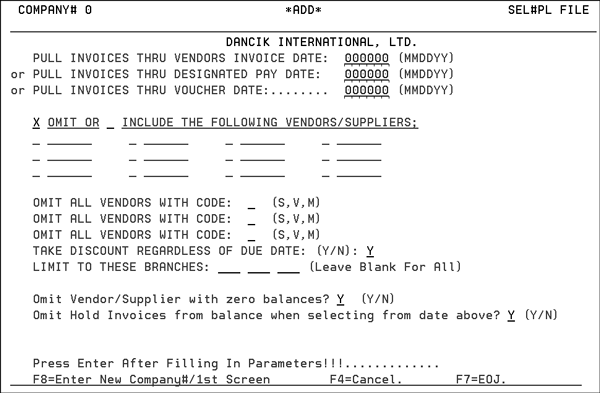- After entry is accepted, press F8 to select for another company number, or press F7 to continue. The invoices are selected for payment and added to a file, which will be processed and removed from the temporary file when checks are printed and posted.