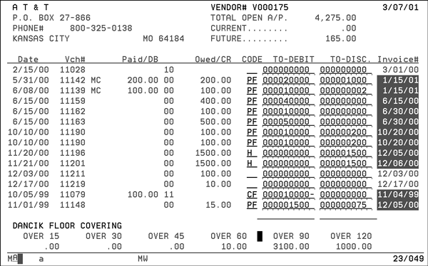 | Owed/CR | The Credit column, which is the amount of vendor's invoice owed or credited for this item. If there is an amount in this column, it is usually preceded by a two-character transaction code indicating the type of item it is. In the preceding example, the transaction code is 00, which means regular bill from vendor precedes each amount. |