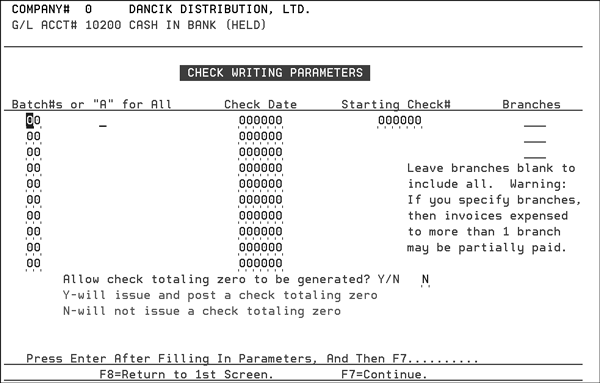 This program lets you to print checks for the items selected using menu options 102 - Select Bills for Payment-company and 103 - Select Bills for Payment-vendor, bills for payment by company and by vendor. You can run checks for some or all of the existing batches of selected items. The program lists the batch numbers, company numbers, and cash account numbers that are required by this program. It also prints a register listing all of the checks.
