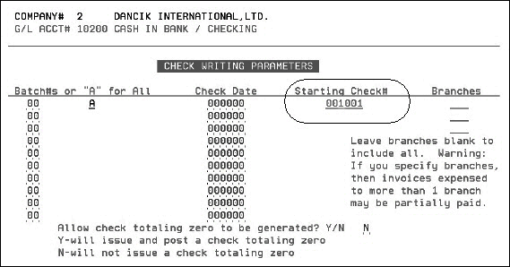 If a Y is entered, checks with zero balances are generated and issued a check number.