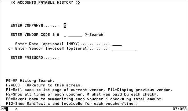 1. On the Process Cash Disbursements menu, enter 117- A/P History to go to the Accounts Payable History screen.