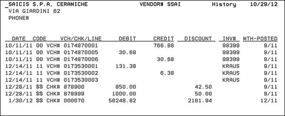 You can review a chronological history by accounting month and date for each vendor or supplier. This program shows each transaction, including all invoices, credits, adjustments, and payments. It also shows which invoices were paid by each check.
