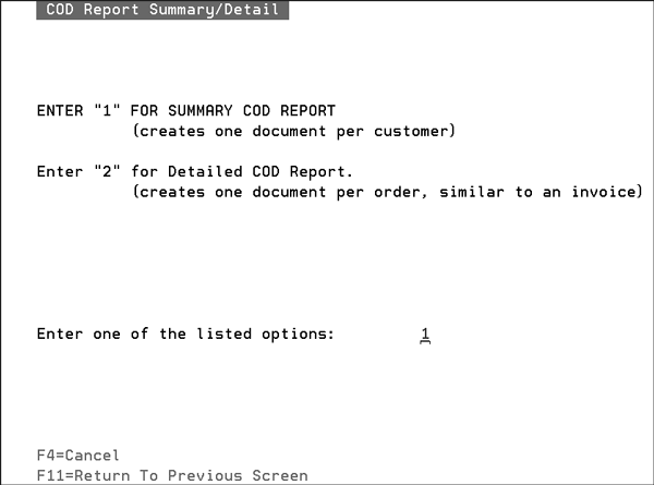 These documents have the same information as an invoice, but are labelled COD report. If multiple orders are included for a customer, only one document includes applicable delivery and minimum order charges. After choosing an option, the following screen is displayed.