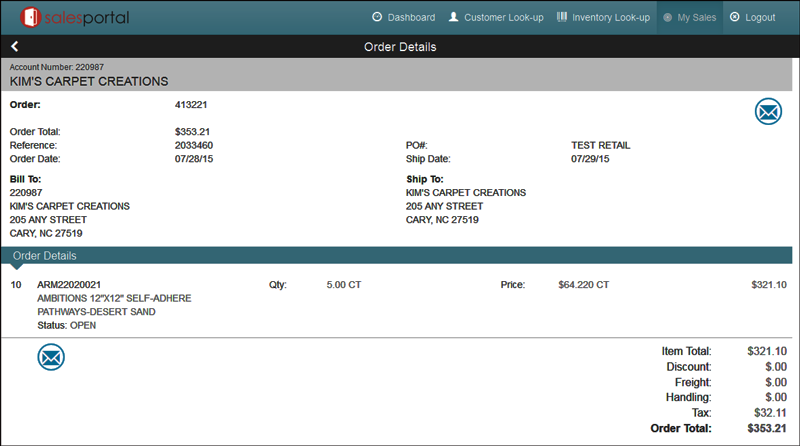 Review the order as needed and/or click the mail icon to send an email to the contacts set-up as internet contacts (Number Type I) on the Phone Number screen of the Billto File.