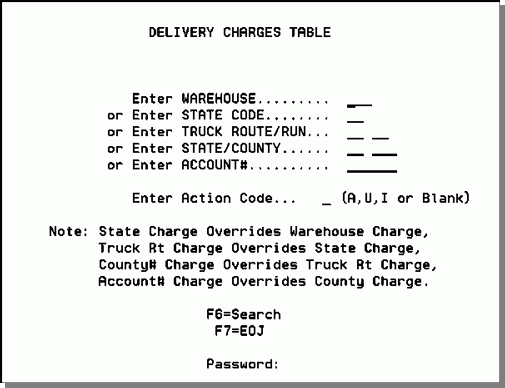 | D/Del | Enter D to delete this delivery charge. When you delete a record, it is also advisable to change the dollar amount to zero in the Delivery Charge field. A high-level password is required to access this field. |