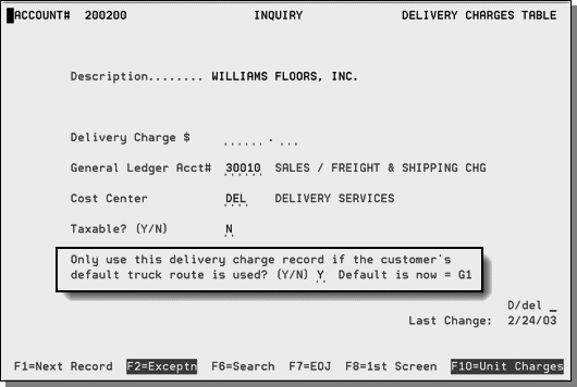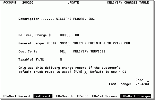 This is the recommended method for assigning and assessing delivery charges. You can use this program to control delivery charges by warehouse, truck route, account number, and state. You can enter varying delivery charges on each of these levels.