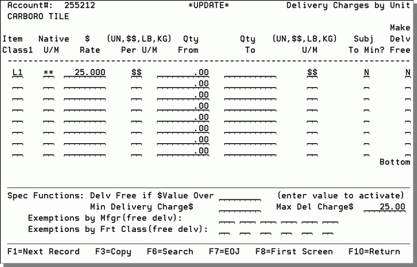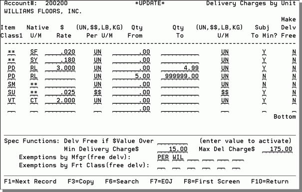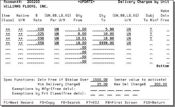 - If the F2 screen has a 'Y' for a free day this overrides the header delivery charge and the F10 unit changes is used. If there are not any F10 unit charges, the delivery charge will then be $0. But if there is a Minimum Order Charge it would still apply and that would be the delivery charge.