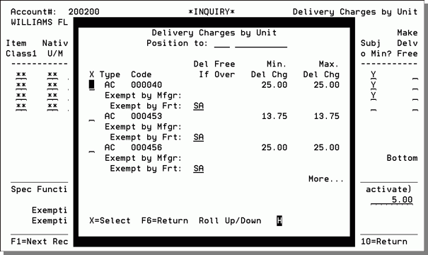 This screen, displayed by pressing F6 from the Delivery Charges by Unit Screen, displays a list of Delivery Charge by Unit records. Use Roll Up and Roll Down to move forward and back. Use the Position To field to restart the search from a specific type and record code. Enter X to select a record.