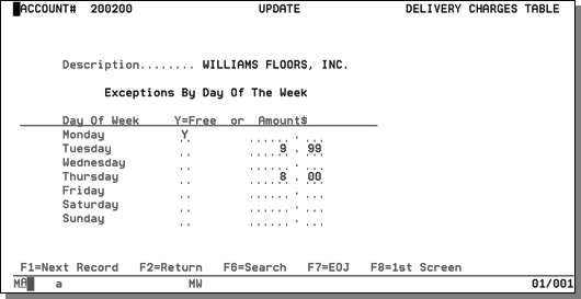 - The header delivery charge is used if the F2 screen has nothing entered for the ship day of week. F10 is also ignored.