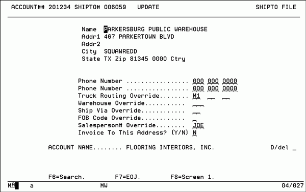 You can use the Shipto File to store information about alternate locations to which you can ship merchandise for customers. Enter shipto records only for customer locations that you ship to regularly. You can enter one-time shipping destinations directly into the Order Entry Program. If the only shipping address for a customer is the address that is in the Billto File record, you don't need to enter shipping records for that customer.