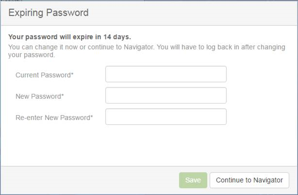 If the Expiring password prompt is displayed and the number of days before expiration is 7 or less, users will not be given the option to "Continue to Navigator". They will be required to reset their password at that time.