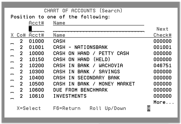 - If you have two G/L cash accounts representing different banks, establish the next check number for each of the respective G/L account's check stock. For example, as shown above Nations Bank next check number is 1001 and Wachovia's is 46751.