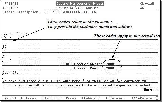 - The customer codes on the left hand side of the screen tie the claim letter to information contained in the claims file. When the letter is processed, the information from the claims file is automatically inserted. The codes such as @A and @B are considered header codes, while other codes such as ?A and ?B are considered detail line codes.