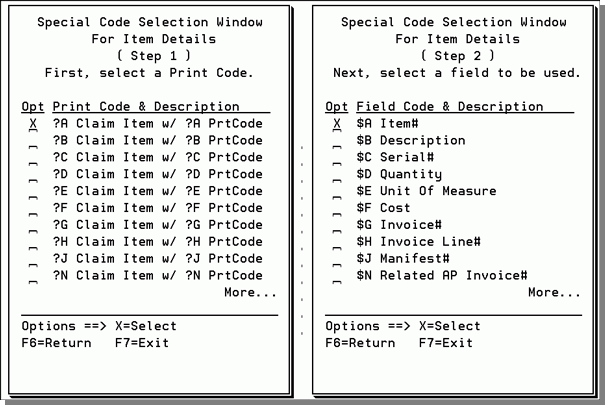 - Notice all the codes relate back to the item information. As mentioned earlier, the item area is the only area of the claims system that is linked to these codes at the present time. When more areas are tied in, some of the codes might read: ?B Claim Supplier or ?C Claim Consumer. Enter an X in an Opt field and press Enter. Another code screen appears, but behind the scenes you are directing the system to the Item Information Screen. The new code screen allows to select fields on that screen.