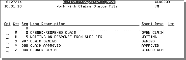 2. The Work with Claims Status File screen lists the statuses that have already been created. Some of them could be user-defined and some are system defined. The system-defined codes are A, X, Y, and Z. You cannot change or remove these codes.