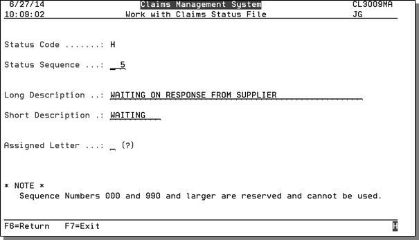 - The Assigned Letter signifies the status code is used mainly for one type of claim letter. To display a listing of all the available letters, enter a ? in the field and press Enter. This entry ties a status back to a letter type (i.e., acknowledgment sent, claim denied).
