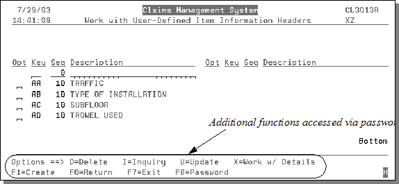 - This screen is basically a list of user-defined fields, which are used in the claims process. From this screen, you can delete, inquire on, update, or create information.