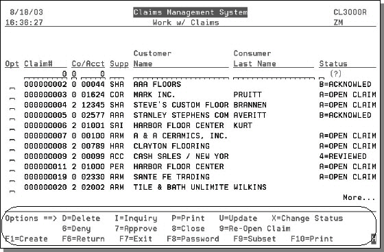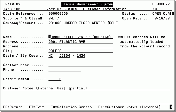 10. Press Enter. The next screen to appear is the Work with Claims - Customer Information screen.