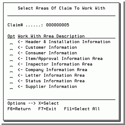 6. You can select the areas individually by entering an X in the appropriate Opt column. Doing this will return you to the Select Areas Of Claims to Work With screen each time you complete an area. You can also select all the areas by entering an X in all the Opt fields. This bypasses the Select Areas Of Claims to Work With screen and goes automat­ically to the screen for the next area. For example, if you select all the areas, when you finish entering Header and Installation Information you will automatically go to the Customer Information area when you press Enter.