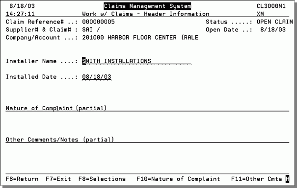 9. After entering the nature of the complaint, press Enter. The Work with Claims - Header Information screen appears with the nature of the complaint information inserted.