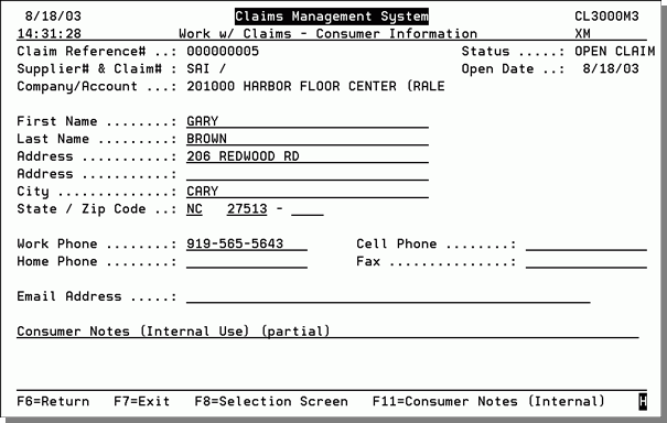 11. Enter the customer information and press Enter. The next screen allows you to enter information about the consumer. The consumer is the person (end user) actually making the complaint. You may optionally enter notes about the consumer by pressing F11.