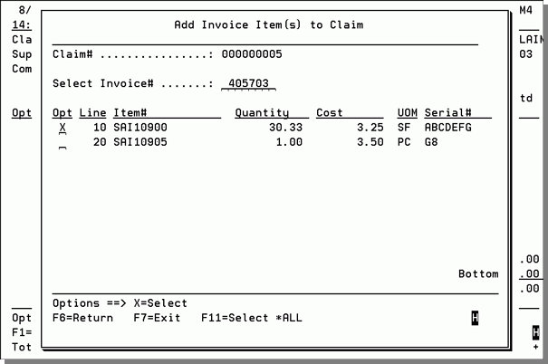 12. Enter the necessary information and press Enter. The Work w/ Claims - Item Information screen appears. Press F10 to add items to the claim, from an invoice. Enter X next to the items that should be included on the claim, or press F11 to select all items on the invoice.