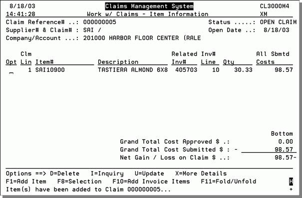 13. After you select the items, the Work with Claims - Item Information screen re-appears with your selected items entered. In the example below, one item was selected for the claim.