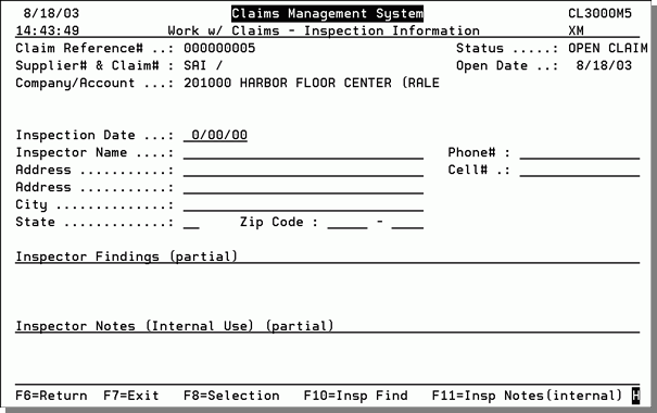 15. Press Enter to continue to the Work With Claims - Inspection Information screen. This is where you enter information about who will inspect the damaged product. When you first enter a claim, you might not know who the inspector is, or you may not require any inspection. If that is the case, leave the fields blank.