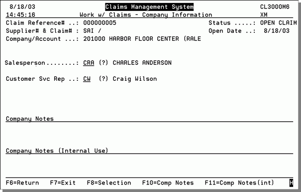 16. Press Enter to proceed to the Work With Claims Company Information area. Company Information relates to your company. Use this screen to enter the salesperson and customer service representatives' code. You can also press F10 and F11 to enter notes (internal and external) about the company.