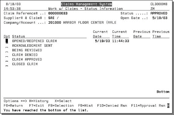 20. Press Enter to display the Status Information screen. The Status Information screen shows if and when each of the claim statuses were achieved.
